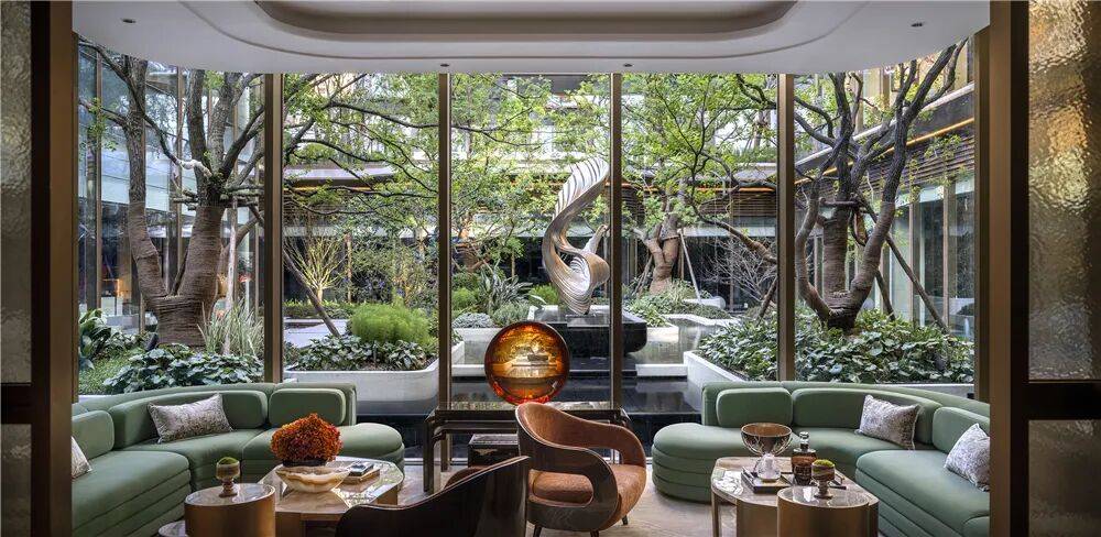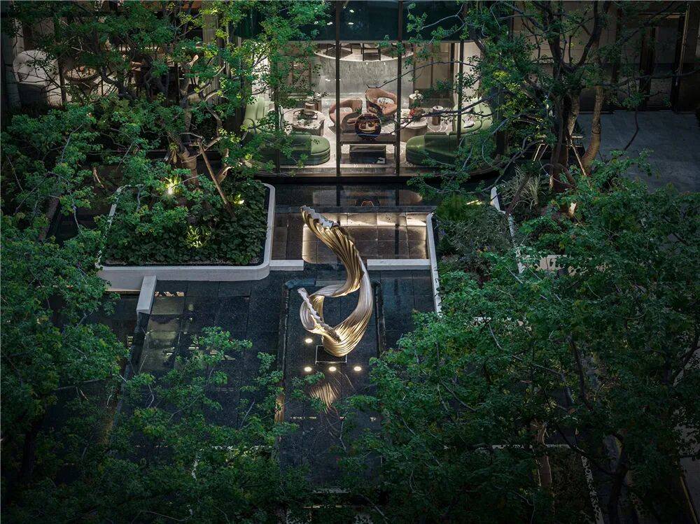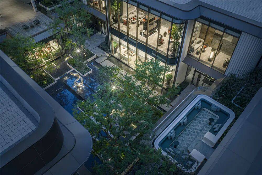这些空间全部在负一层,以围合式布局,环绕下沉式中庭景观而建,并采用大面积玻璃景墙。