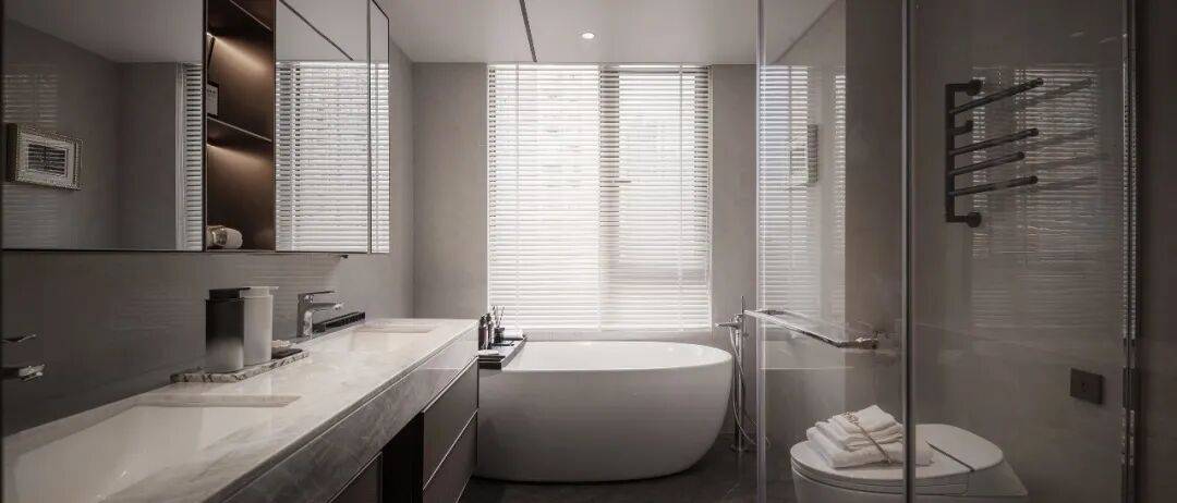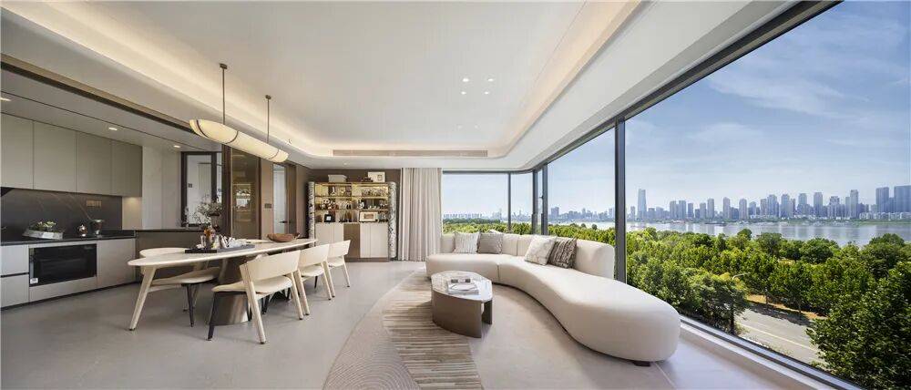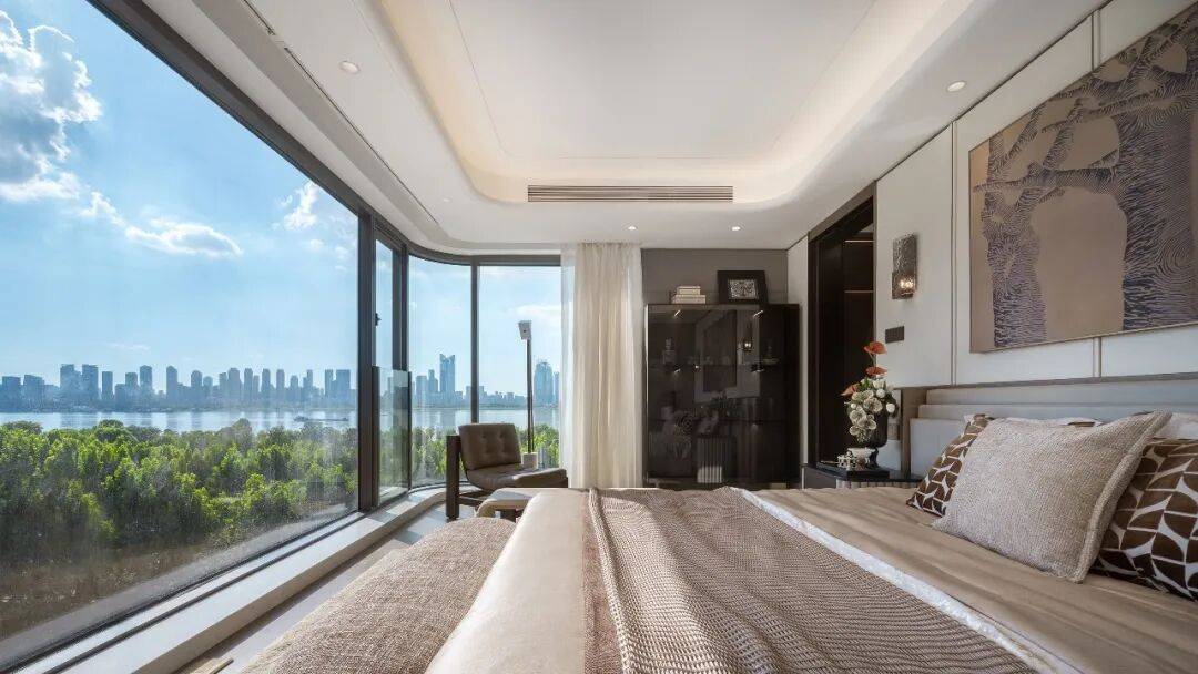 而建面约183㎡户型的主卧设计有三面落地窗,并且全屋实现了双“全景舱”设计,将长江及铁路公园景观转化为“动态壁纸”。