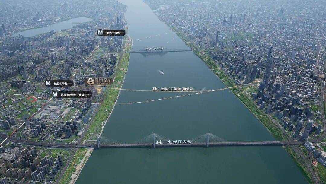 而二七路过江通道正从武汉城建·江南岸旁下穿,对岸出口在周大福金融中心附近。