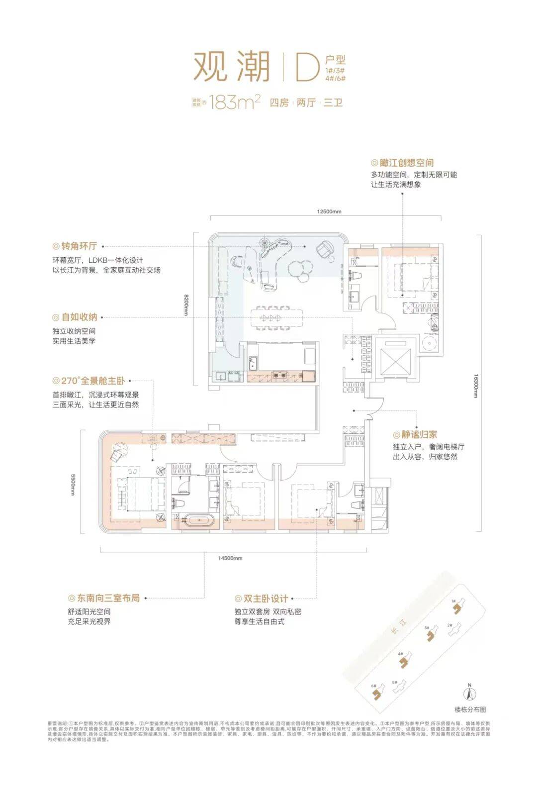 183㎡的户型能够与武昌滨江在售某豪宅230㎡的户型媲美,都是客厅和一个卧室朝北,都是为了更好的看江效果。