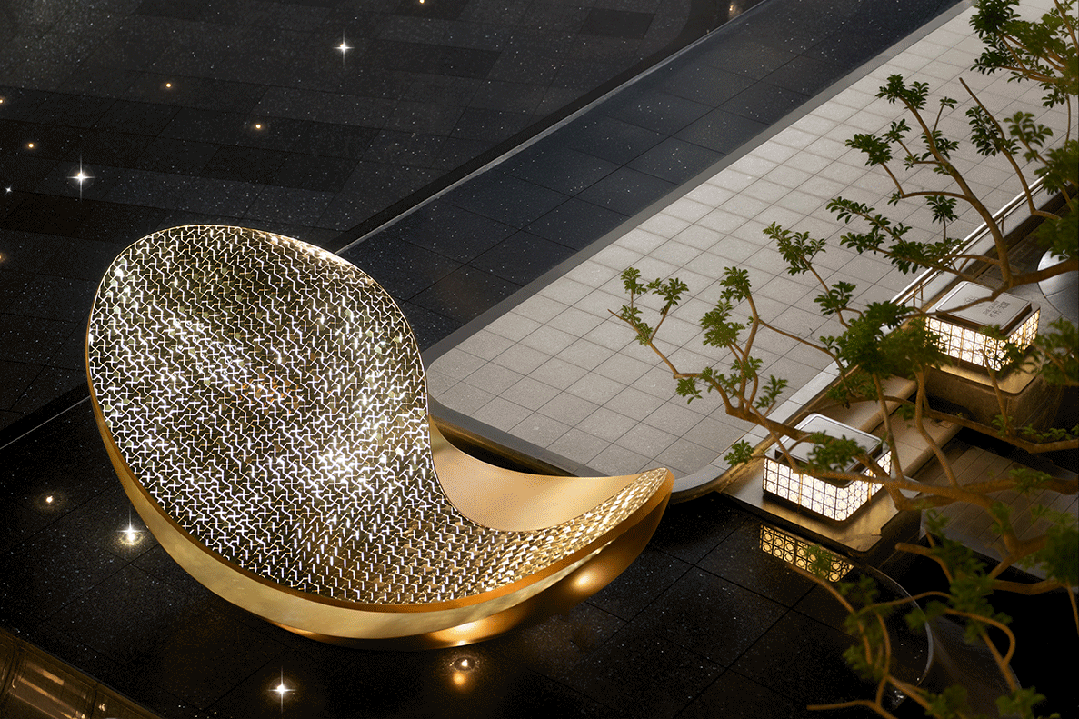 庭院中的“星月聚宝盆”在模拟了聚宝盆广聚财气的造型,形状犹如皎月,内里点缀星芒。月光下反射出的点点光斑,是这处留白空间的点缀。