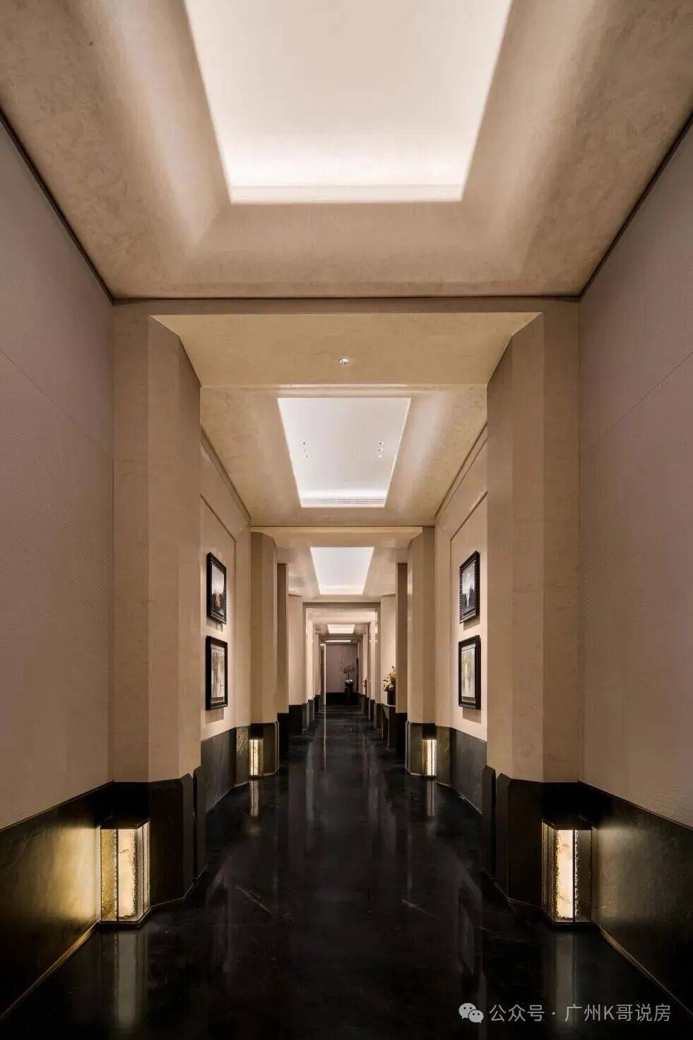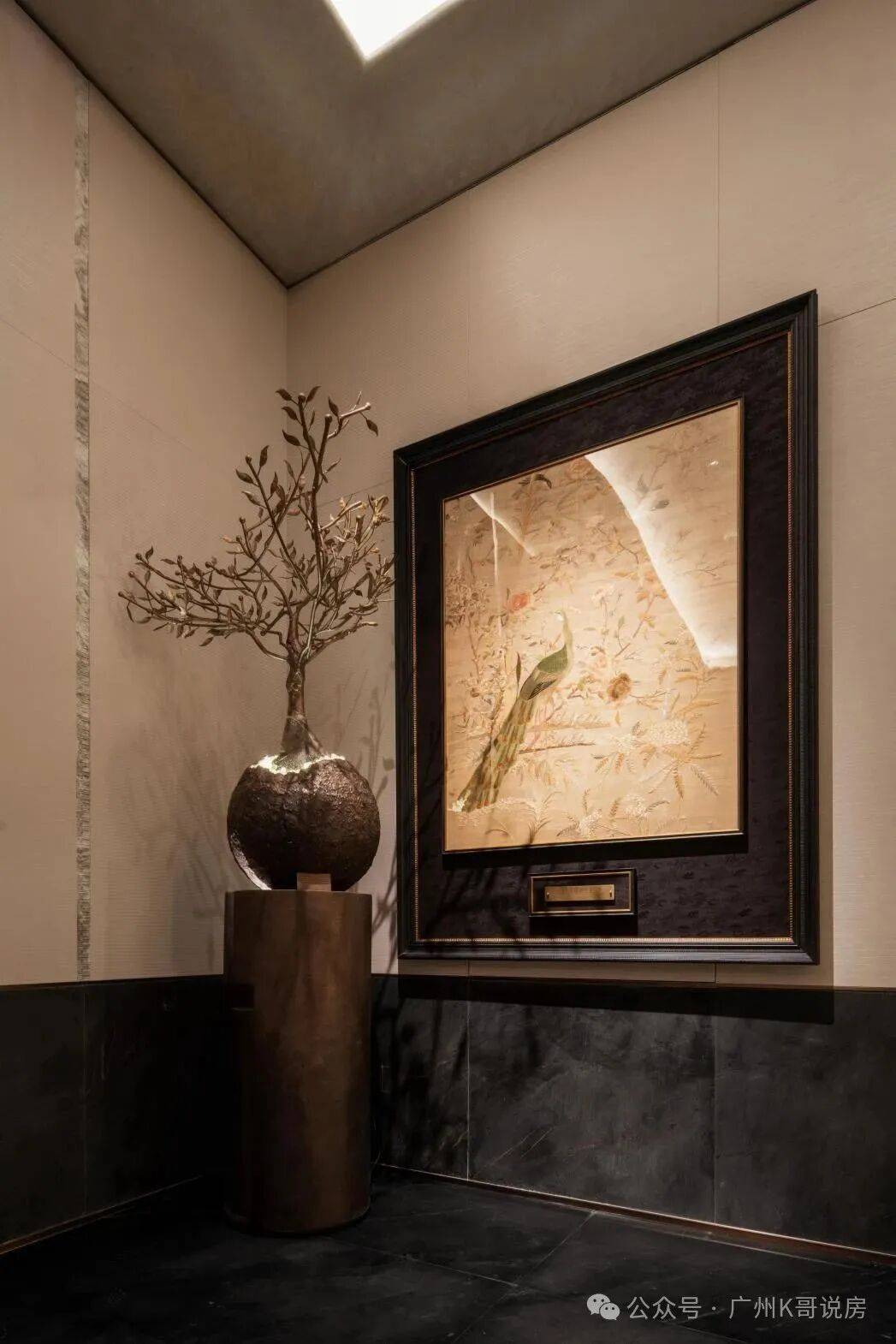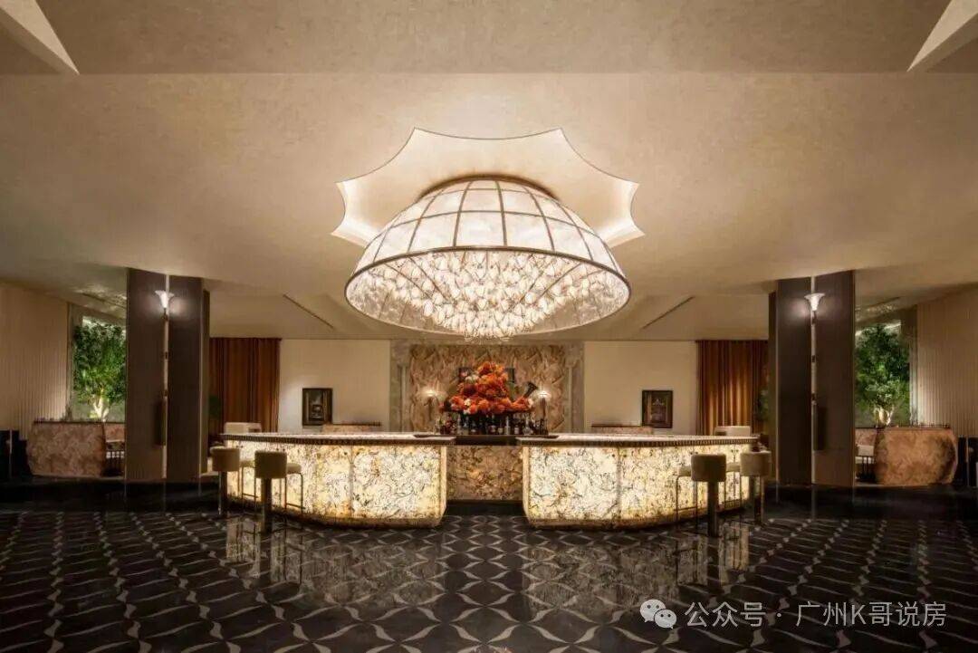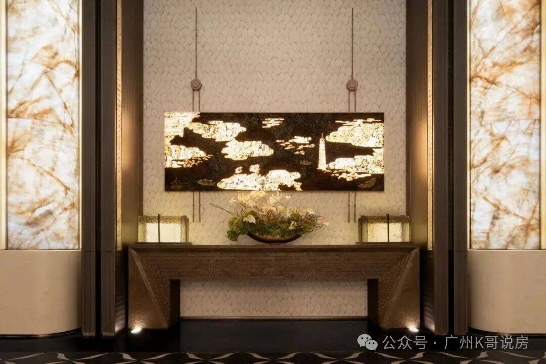 透过中空挂落,日光倾泻而入下方的“金石浮光”的艺术雕塑,阳光与金石肌理交织出细腻的纹理,低调奢华的氛围扑面而来。