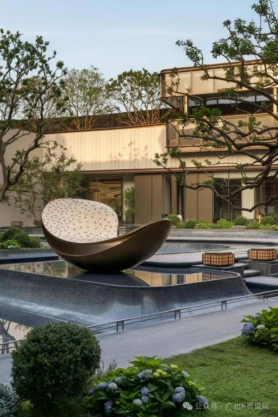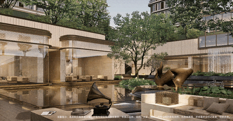 下沉庭院以精致金属线条搭配玻璃材质,极具现代时尚。前庭水景设艺术雕塑和繁茂绿植,镜面透出建筑倒影,自然且舒适。