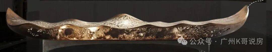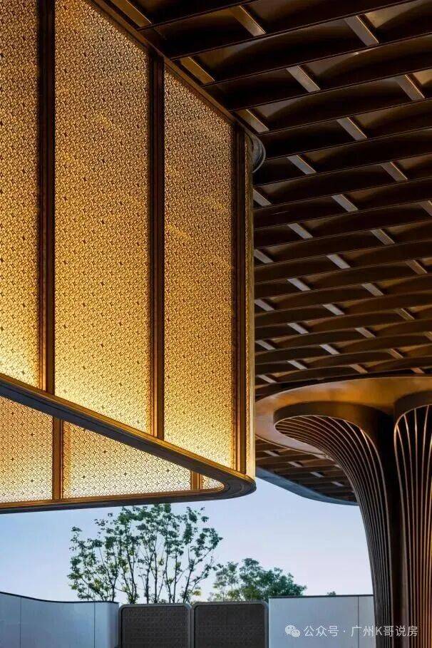 由广东非遗剪纸大师饶宝莲亲手打造的“勇立潮头舟”跃然眼前。整个作品采用铜凿剪纸和金漆木雕结合的工艺,镂空雕刻了羊城八景的纹样。在庭院水景的映衬下,犹如龙舟竞渡,生生不息,寄寓着天曜业主抢占先机,敢为人先的进取精神。