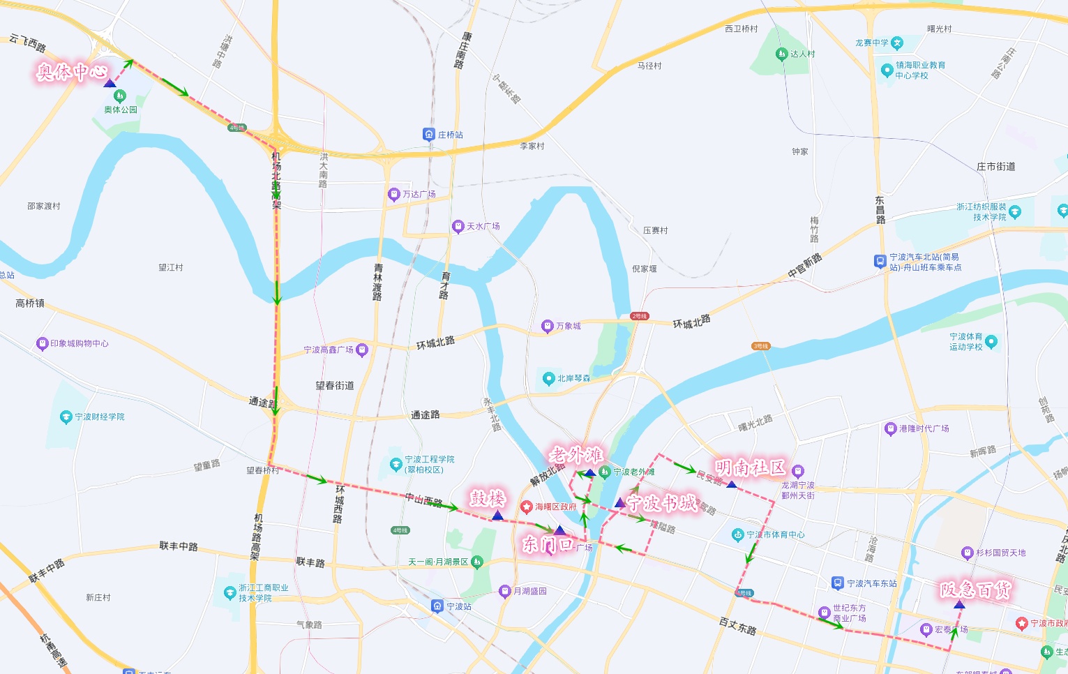 线路走向充分考虑市民出行需求,从宁波奥体中心始发,途经鼓楼、东门口天一广场、老外滩、宁波书城、明南社区、阪急百货等核心商圈与客流密集点。