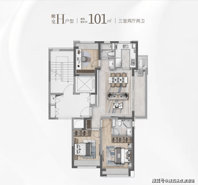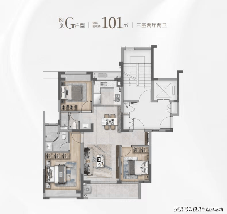 建面约101㎡精装3房,均价4.53万/㎡,总价400万级。采用霍尼韦尔新风、AO史密斯地暖 + 空调、西门子厨电(含洗碗机),全屋飘窗 + 无连廊设计,得房率超80%,每一寸空间都得到极致利用。