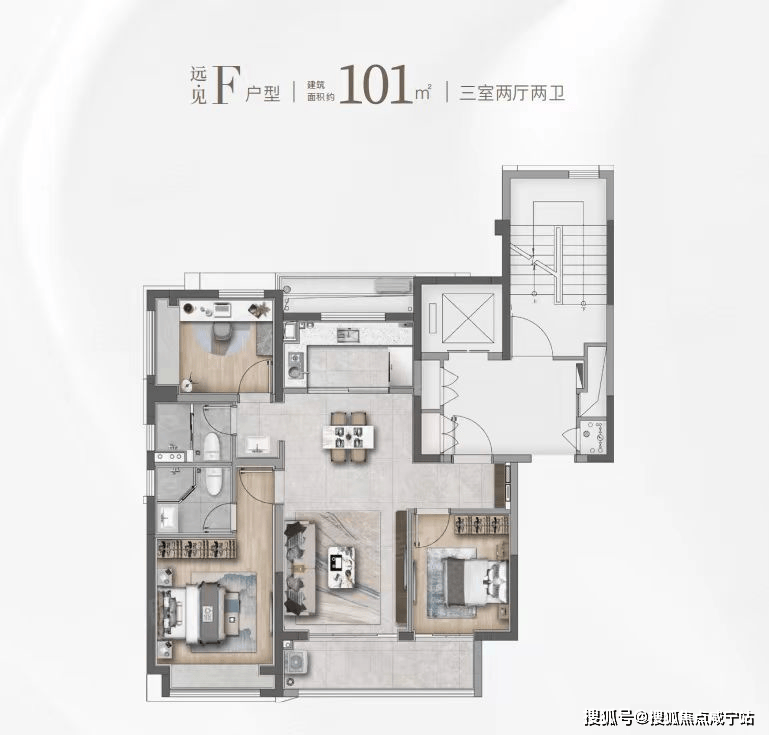 同样是3房2卫的配置,功能性与舒适度兼具。该户型惊艳的地方在于大尺度的景观边厅设计,搭配超大阳台,